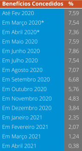 Os valores de benefícios com data de início nos meses de março e abril de 2020 tiveram neste ano o reajuste adequado a variação negativa do INPC ocorrida naqueles meses.