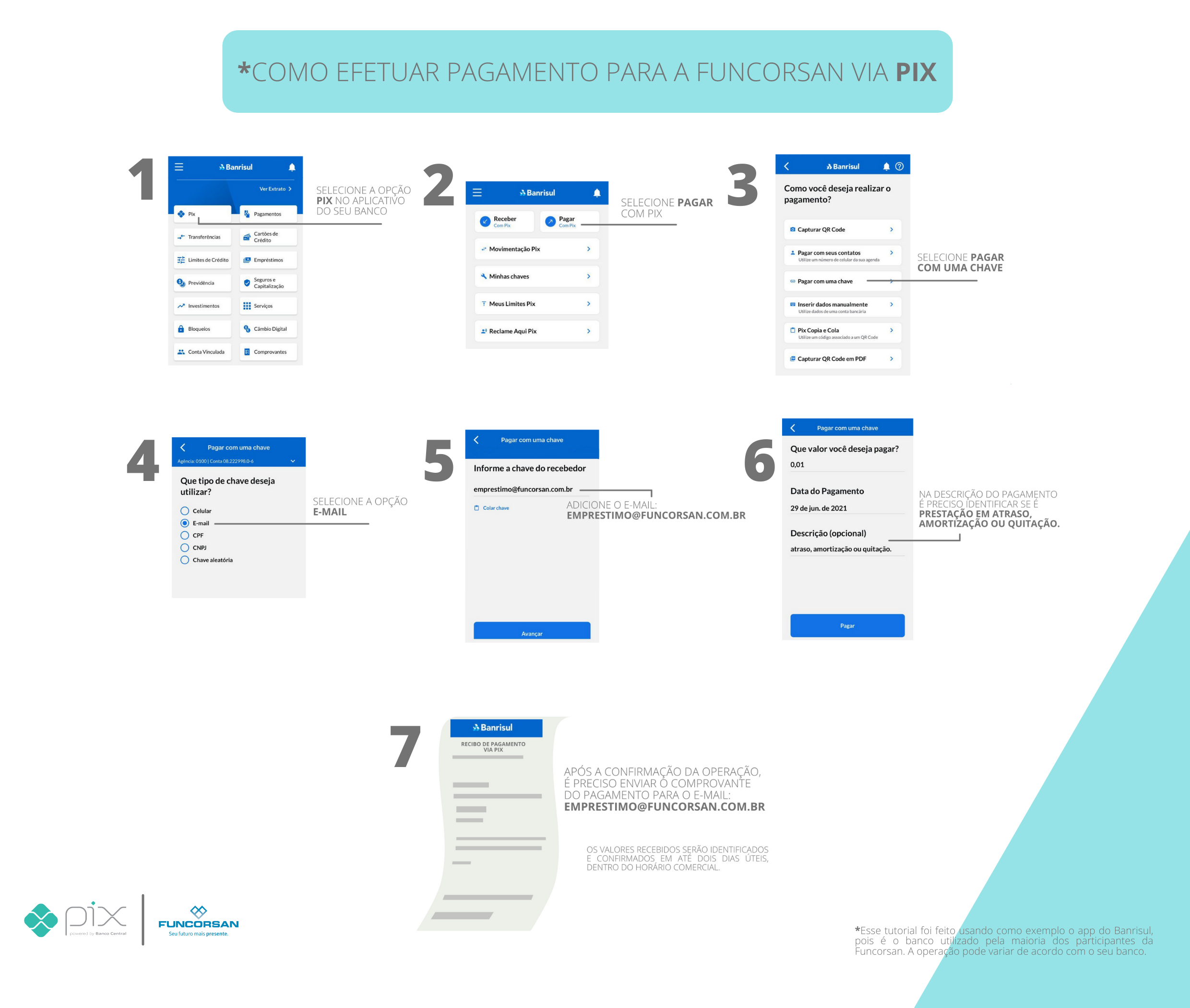 Para realizar um Pix basta usar a nossa chave emprestimo@funcorsan.com.br no campo de pagamentos via PIX no app do seu banco. Não serão considerados pagamentos nessa chave para outros fins, a não ser para empréstimos. Apenas o titular do empréstimo pode utilizar essa opção.